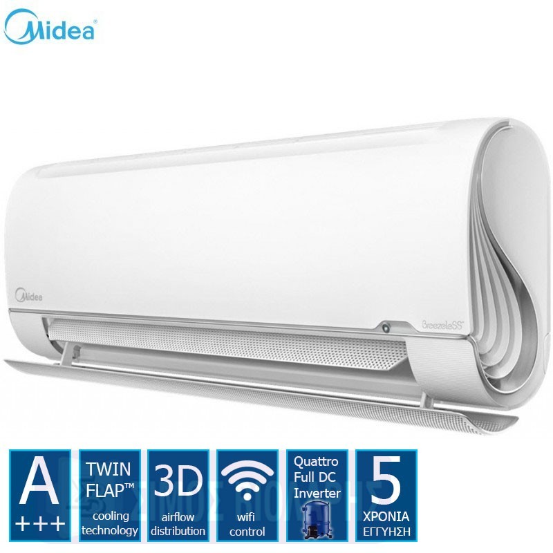 BreezeleSS+ air conditioner from Midea, with innovating technology, is here to cover even more the most demanding needs of the modern consumer. With Quattro Full DC Inverter motor, it reaches maximum performance with minimal consumption that reaches up to A+++ in cooling ! Also, thanks to the innovative Twin Flap design with 7,928 micro-holes and S-Wing side air outlets, it offers you the ideal air diffusion in your area with minimal noise, while the Speedy Cool Fan technology gives ideal temperature within 40 seconds!