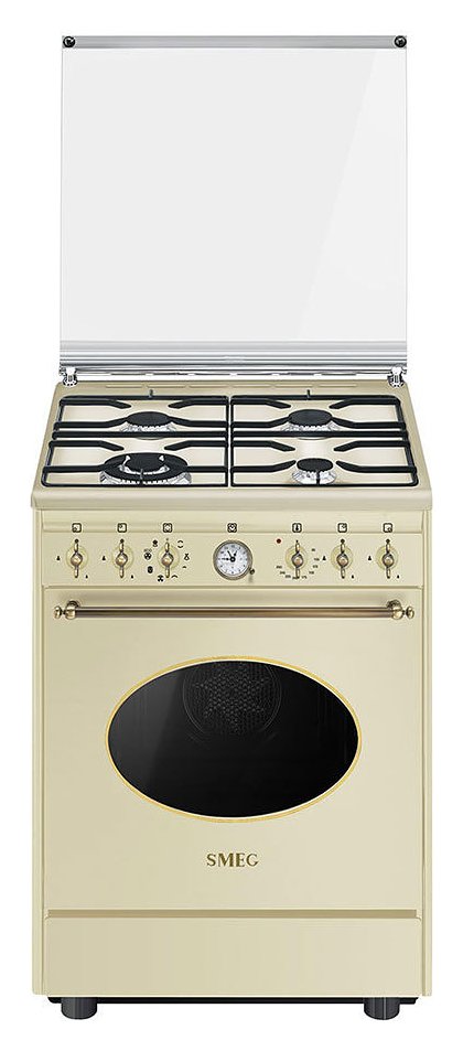 Smeg CO68GMP9 Gas Electric Cooker 60cm wide in Cream color from Coloniale Series, A Energy Class and total capacity of 70L. Features multifunction oven with 8 cooking modes, 4 High Effiecency burners including Wok Burner, EasyClean enamel and VaporClean hydrolytic cleaning.