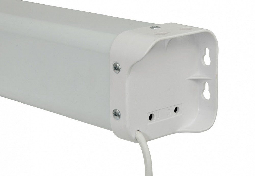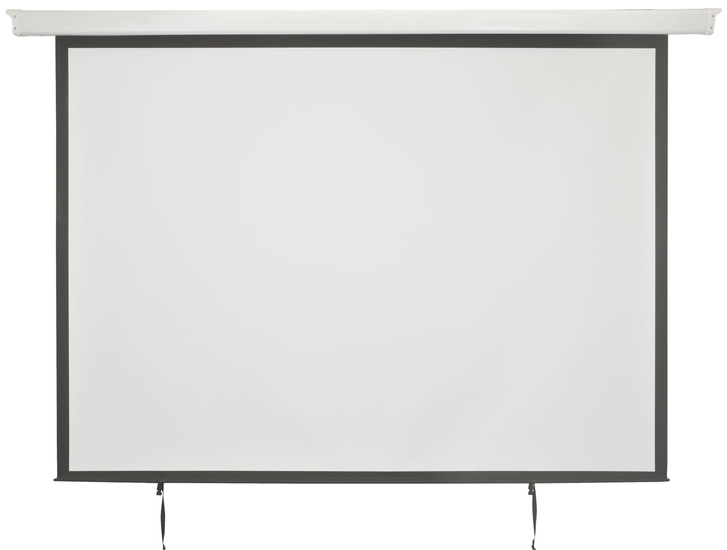 Projector screen with built-in electric motor controlled via the in-line switch or remote control. The screen is housed in a white steel case with mounting brackets on either end, allowing installation onto ceilings or walls. The screen itself has a weighted bottom bar to prevent the screen jamming in the case or curling. It supports many types of installation such as classrooms, auditoriums or places of worship.