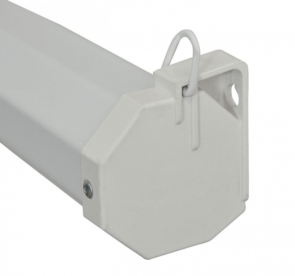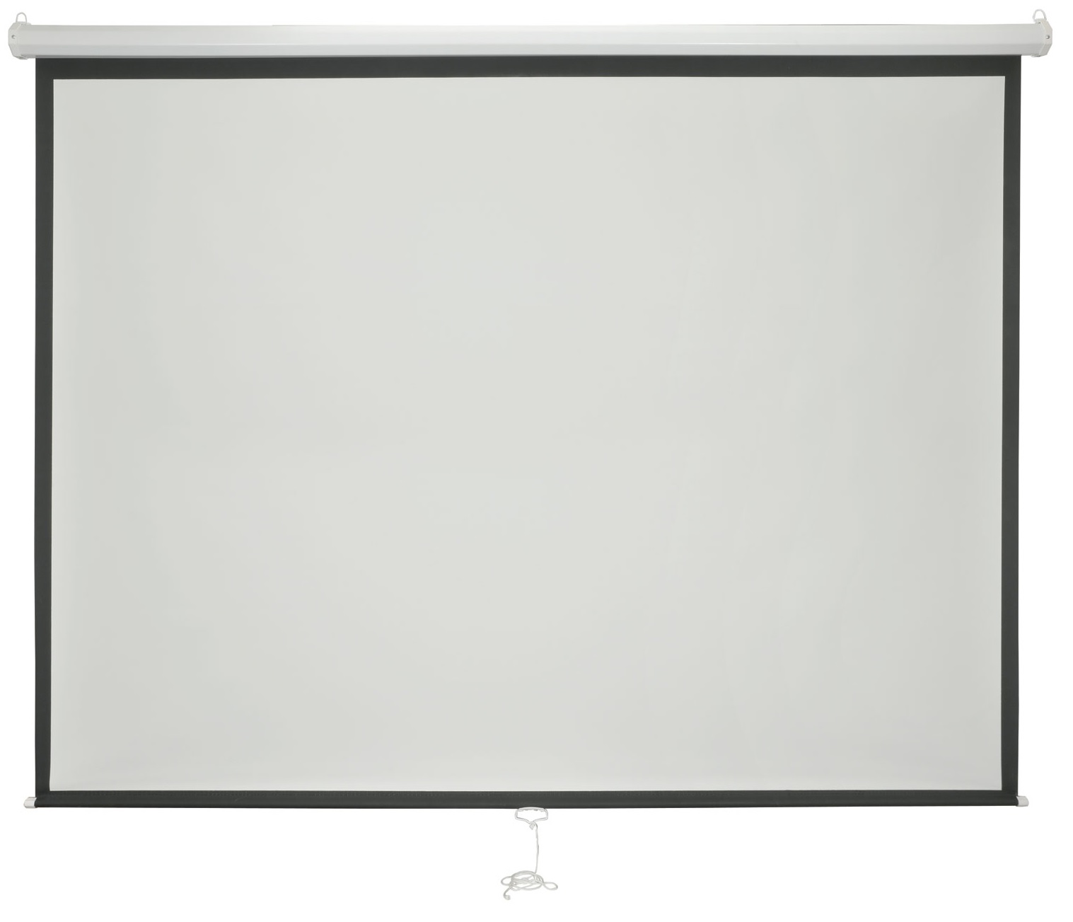 A manual screen which can be pulled down to the desired level and set by the auto lock function. When not in use the screen will retract back into the housing smoothly when the lock is released via the integral spring mechanism. The screen is housed in a white steel case with mounting brackets on either end, allowing installation onto ceilings or walls. The screen itself has a weighted bottom bar to prevent the screen jamming in the case or curling. It supports many types of installation such as classrooms, auditoriums or places of worship.