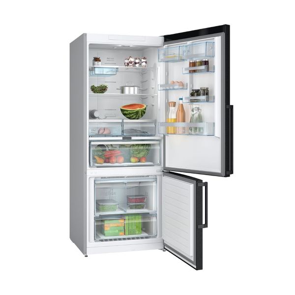 Bosch Fridge Freezer from Series 6, Full NoFrost 75cm width and XXL capacity of 526L. Features LED lighting, TwinCooling System for keeping food in suitable conditions, Multi Air Flow for uniform air distribution, EasyAccess shelf and electronic temperature control. In addition, features SuperCooling & SuperFreezing function, BigBox on the freezer and VitaFresh Plus with humidity control drawers for fruits and vegetables.