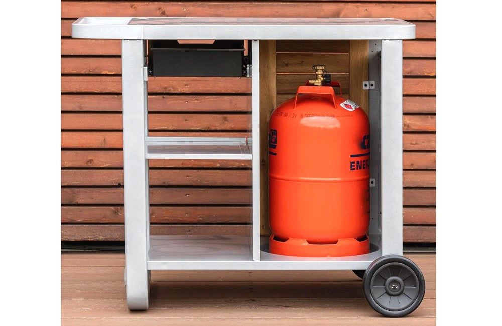 - Equipped with a wooden front panel and closed on one side to hide the gas bottle.