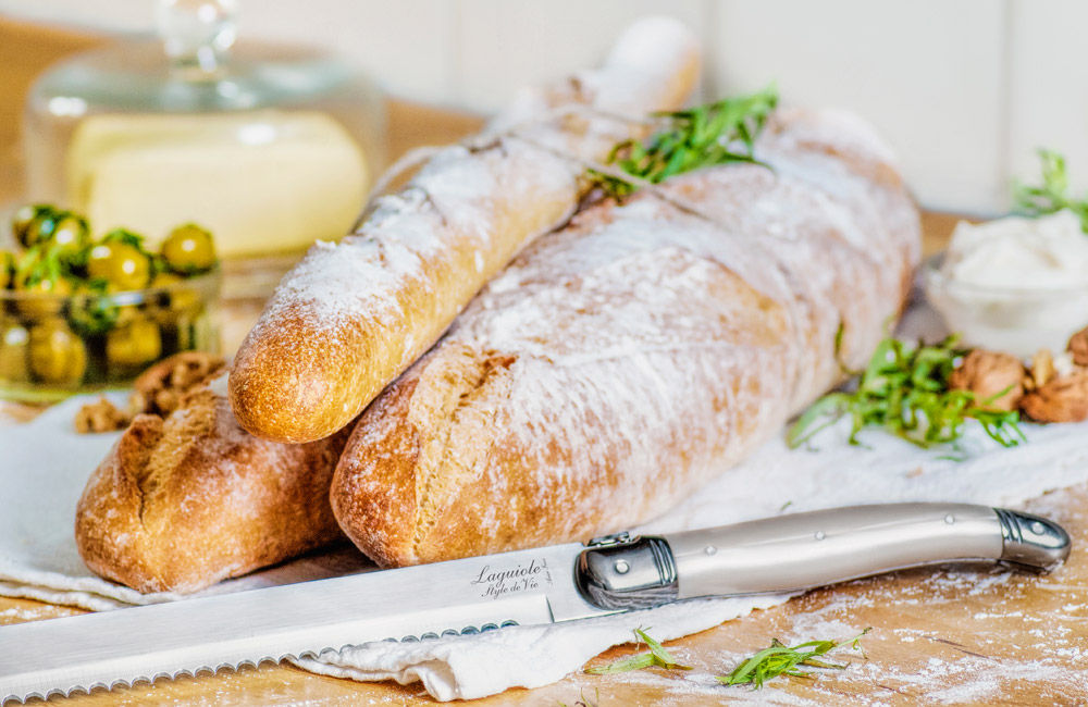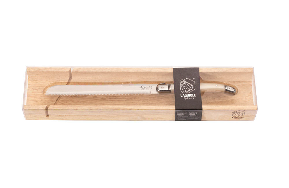 Laguiole Premium Line Bread Knife Pearl Packed in a Wooden Baquette Cutting Board 1.5 mm Thick Blade 301005