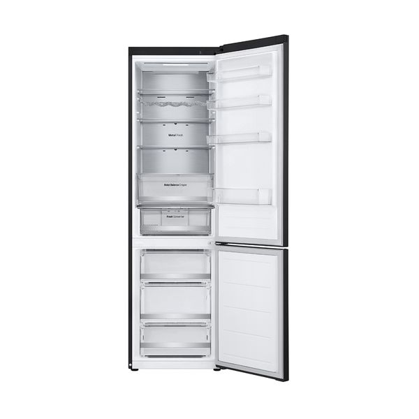 Lg GBV5250DEP bottom freezer Total No Frost Refrigerator, D Energy Class and total net capacity 387L, in Black Matt finish. Features the Linear Compressor with a 10-year warranty, fast & uniform cooling everywhere thanks to DoorCooling+™, Multi Air Flow & Metal Fresh technology for even temperature and the ability to check and identify any faults via Smart Diagnosis.