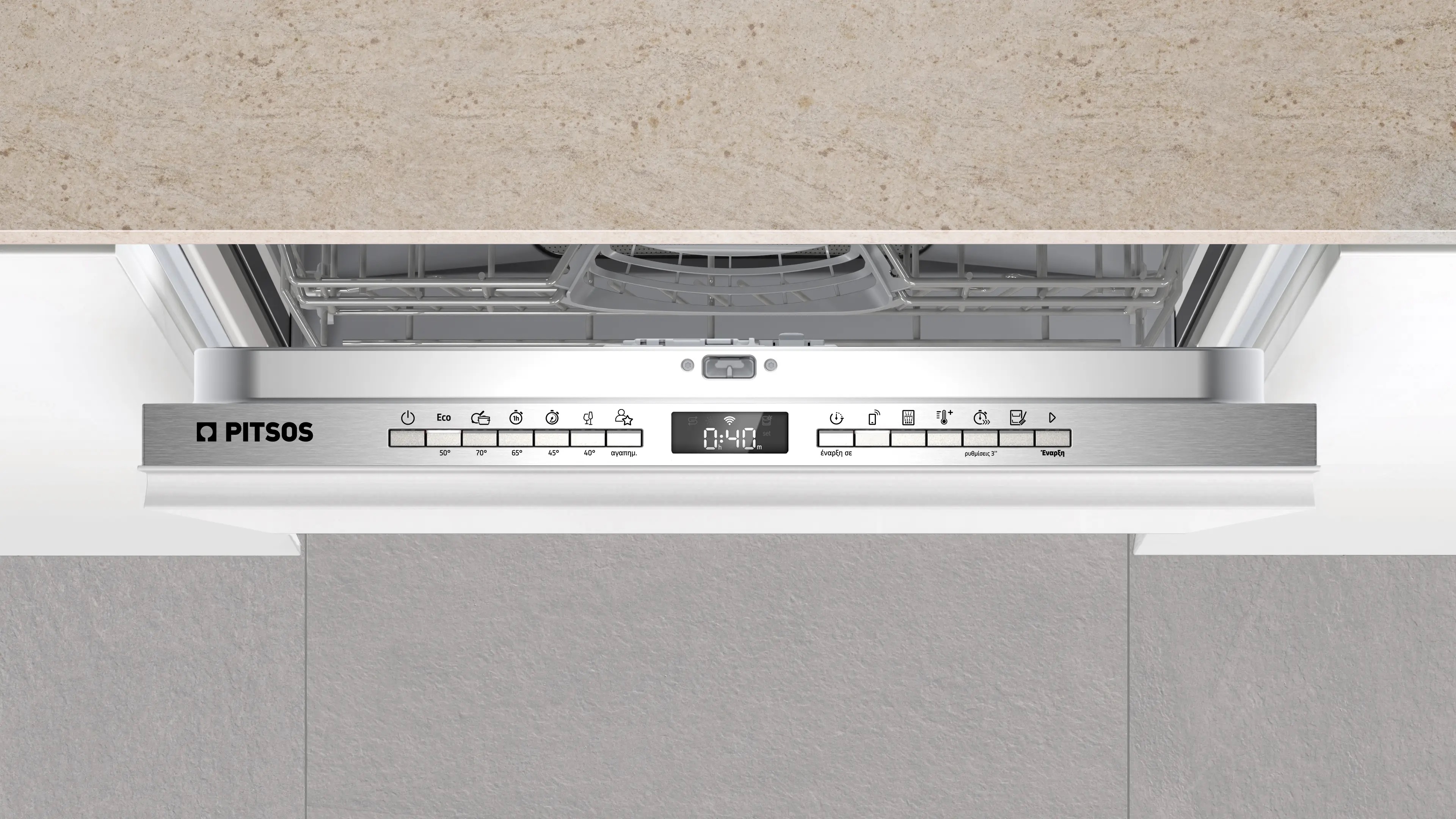 The fully integrated Pitsos DVF61X02 dishwasher combines outstanding loading flexibility with smart technology, delivering impeccable results in every wash cycle. Featuring the innovative flexblue basket system, a practical cutlery drawer, an adjustable upper basket, and the Extra Fast function that reduces washing time even while the cycle is running, it adapts perfectly to the demands of everyday life. In addition, the 1-hour 65°C program ensures sparkling clean dishes in just 60 minutes, while Home Connect gives you full control from wherever you are — for limitless convenience.