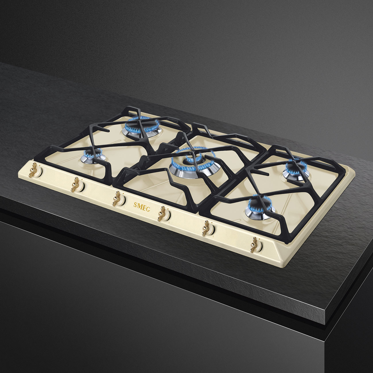 Smeg built in gas hob from Coloniale Series, 90cm width. Features Cast Iron pan supports for maximum stability and cooking convenience, easy operation via knobs with automatic ignition system, automatic gas shut-off safety system and 5 burners of 1100W, 2x1700W, 1x3100W and Wok Burner of 5000 W.