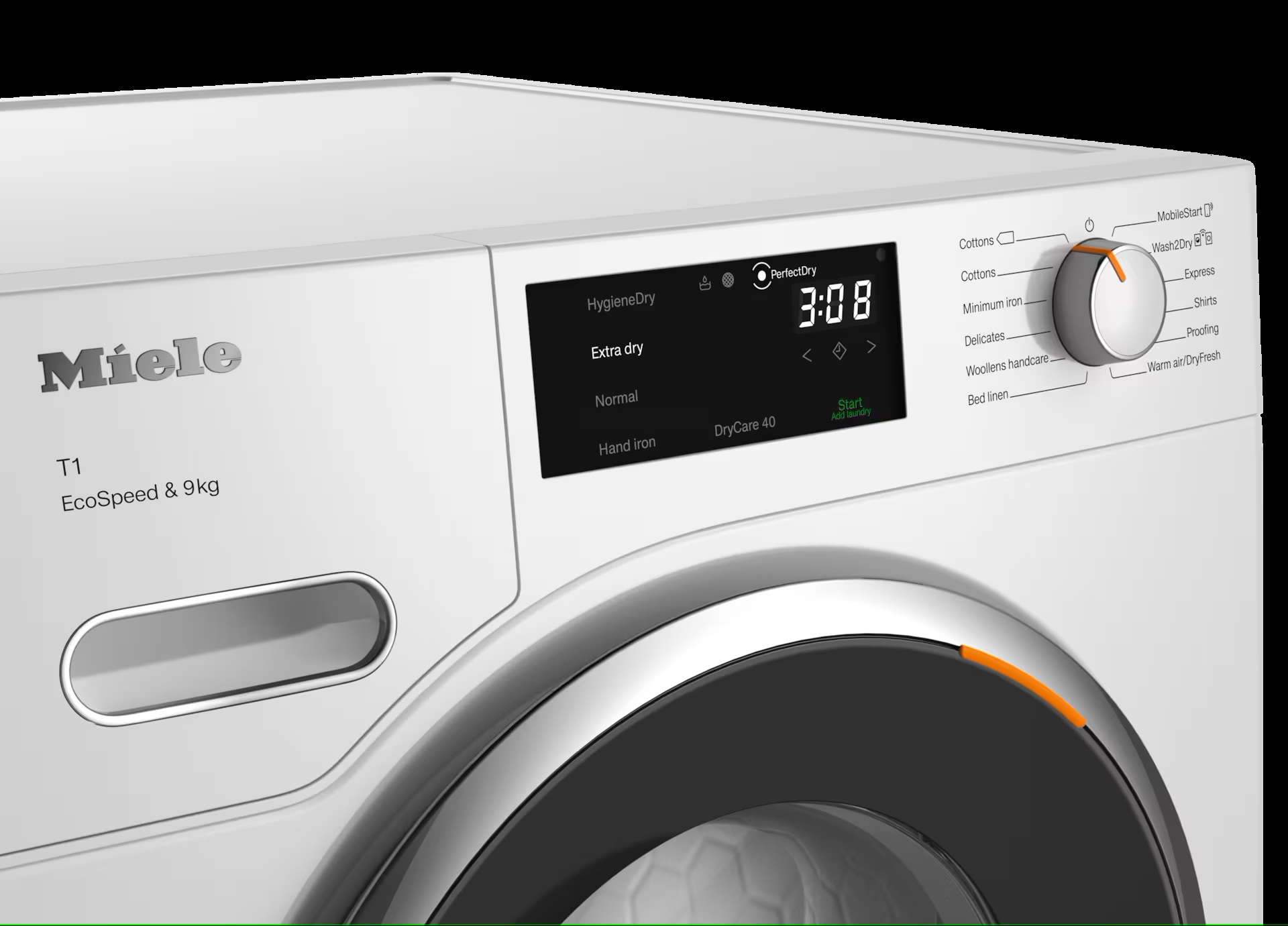 Tested for excellent clothing care for 20 yearsDuring the development phase of the W1 washing machine series, Miele carries out endurance tests on models and key components over 5000 wash loads (= 5 wash loads per week for 50 weeks a year) in various programmes. For more information: miele.com/20years Heat pump technology – low consumption, gentle drying The SilenceDrumPatent EP 4 163 433reduces noise for much quieter drying No more sorting out clothes with DryCare 40 for 40°C washesNot suitable for wool or silk. HygieneDry removes up to 99.99% of bacteria* and 99.9% of virusesTests were carried out for Bacillus subtilis and Saccharomyces cerevisiae bacteria at the HygieneDry drying level with half a load.