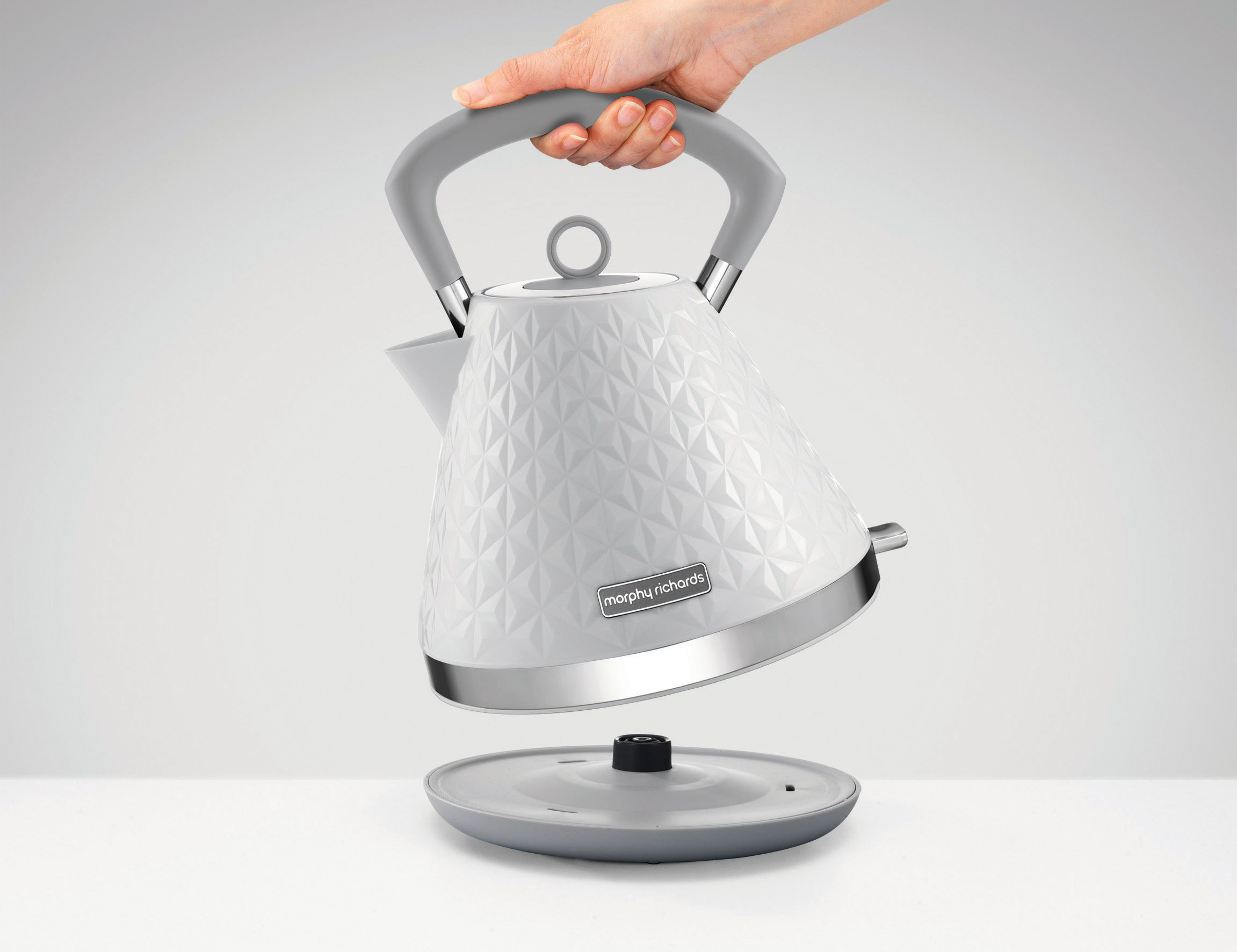 Morphy Richards kettle from Vector Pyramid Series with 1.5L water capacity. Features easy-to-read water level indicator on both sides, ergonomic operation with easy opening of the lid at the push of a button, 360o degree cordless base, boil-dry protection & auto shut off when water boils, concealed 3000W heating element for easy cleaning and removable and easy-to-clean Limescale filter prevents limescale in the drink.