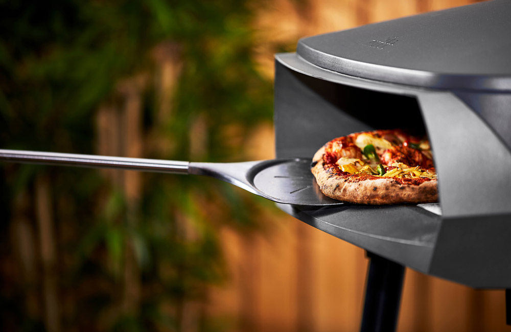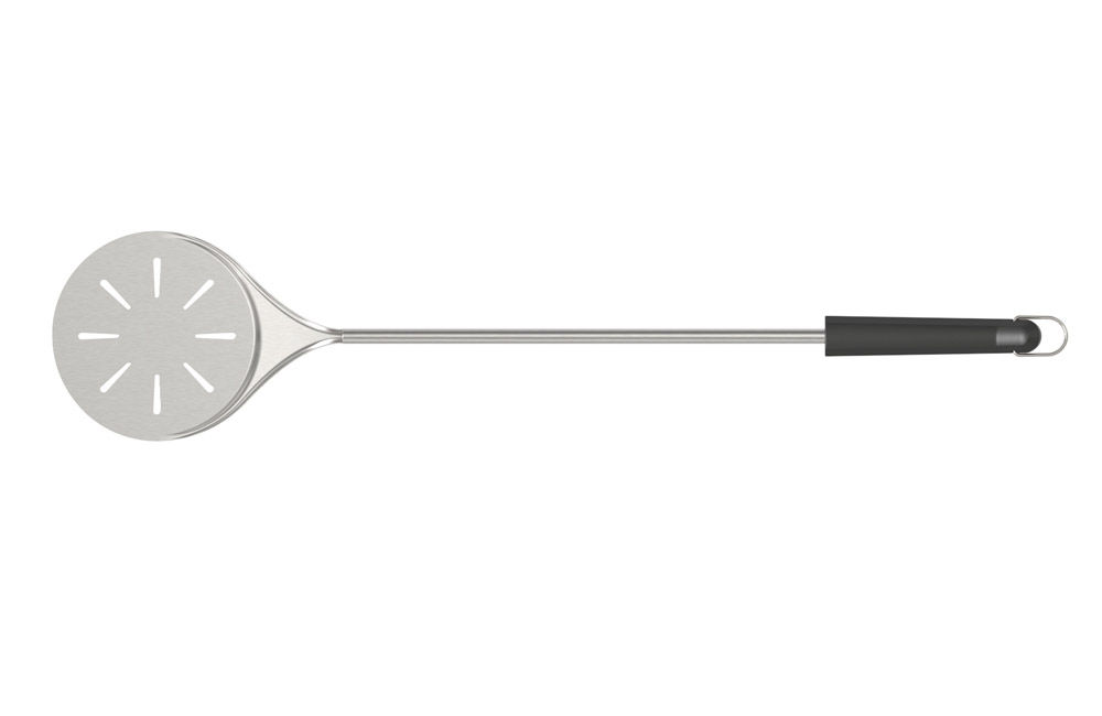 An ultra thin stainless steel pizza turning peel, perfect for turning pizzas inside the pizza oven.