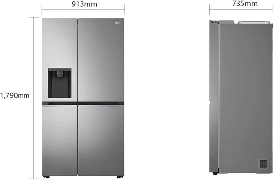 Lg GSJV71PZTE side by side refrigerator with 635L total net capacity, E energy class in Platinum Silver color. Features Linear Compressor for better energy savings, water supply from an internal tank, no need to connect to water and plumbing and Door In Door for easier access to essential products.