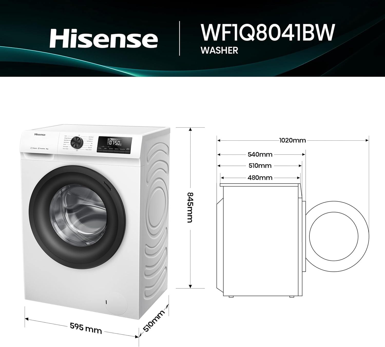Hisense WF1Q8041BW washing machine 8Kg capacity, 1400 rpm, A-20% energy class. Features Steam Wash which removes 99.99% of bacteria from clothes, ensuring maximum hygiene - ideal for allergy sufferers, Durable Inverter Motor for silent operation and PowerWash 49' & QuickWash 15' high-quality washing for mini loads.