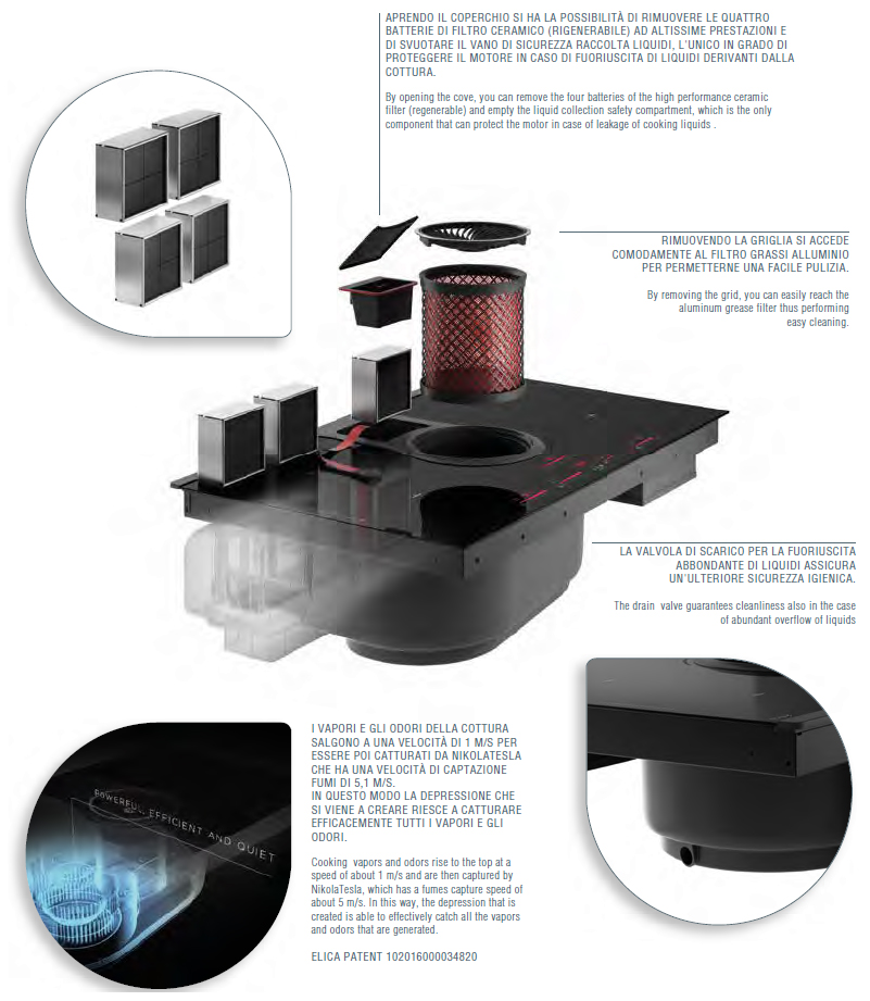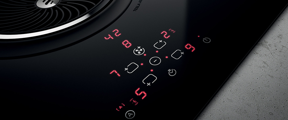 NikolaTesla One is charactertized by a refined and contemporary aesthetic capable to stand out and to bring value to any environment. A perfect synthesis of cooking and suction, an intelligent, powerful and silent product that offers consumers a real revolution in the kitchen, for unprecedented results : 4 cooking zones, 1 bridge area, the best technology used to keep the food temperature under control, 5m/s fumes and odors collection speed rate, 67dBA of noise, A+ energy class rating.