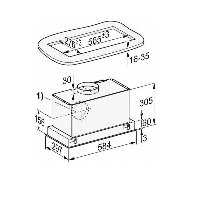 Construction type Integrated extractor •Design Colour No colourRAL colours available as customisation on request •Customisation possible on request •Operating modes Type of air guide ConvertibleActive charcoal filter (order separately) DKF19-1User convenience Electronic controls •Light-touch controls •Power levels (number without Booster level) 3Booster level •Cleaning convenience Easy-to-clean canopy interior – CleanCover Filter system Number of dishwasher safe stainless steel grease filters 1Lighting LED •Light intensity in Lx 350Colour temperature in K 3,000Fan Dual-action fan AC motor •Air throughput with max. duct diameter in extraction mode (not for external version) Air throughput in Level 1 (m³/h) 250Air throughput in Level 2 (m³/h) 300Air throughput in Level 3 (m³/h) 360Air throughput in Booster level (m³/h) 600Sound power in Level 1 (dB(A) re 1 pW) 47Sound power in Level 2 (dB(A) re 1 pW) 48Sound power in Level 3 (dB(A) re 1 pW) 52Sound power in Booster level (dB(A) re 1 pW) 64Sound pressure in Level 1 (dB(A) re 20 µPa) 31Sound pressure in Level 2 (dB(A) re 20 µPa) 34Sound pressure in Level 3 (dB(A) re 20 µPa) 38Sound pressure in Booster level (dB(A) re 20 µPa) 50Air throughput in recirculation mode Air throughput in Level 1 (m³/h) 190Air throughput in Level 2 (m³/h) 250Air throughput in Level 3 (m³/h) 320Air throughput in Booster level (m³/h) 500Sound power in Level 1 (dB(A) re 1 pW) 54Sound power in Level 2 (dB(A) re 1 pW) 60Sound power in Level 3 (dB(A) re 1 pW) 64Sound power in Booster level (dB(A) re 1 pW) 72Sound pressure in Level 1 (dB(A) re 20 µPa) 39Sound pressure in Level 2 (dB(A) re 20 µPa) 45Sound pressure in Level 3 (dB(A) re 20 µPa) 49Sound power in Booster level (dB(A) re 1 pW) 57Safety Safety switch-off Technical data Canopy width in mm 584Canopy height in mm 63Canopy depth in mm 297Net weight in kg 11.0Length of supply lead in m 1.5Standard plug fitted •Total rated load in kW 0.23Voltage in V 230Fuse rating in A 10Number of phases 1Installation notes Extraction ducting connection at top •Extraction connection at top and rear •Diameter of extraction ducting connection in mm 150Standard accessories Non-return flap Adapter to reduce ducting diameter from 150 mm to 125 mm Ø • Downloads