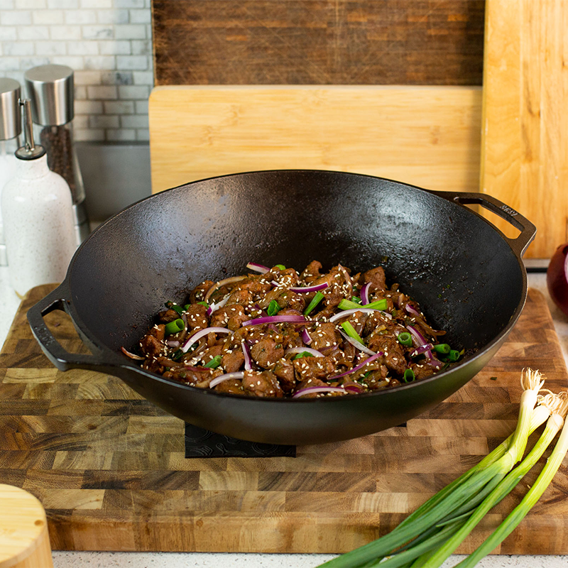The generous, bowl-shaped cooking surface and unbeatable heat retention of the 14 Inch Wok make it the perfect tool for everything from classic stir-fries and ramen to fajitas and scrambled eggs. Designed with deep sidewalls to keep everything contained as you cook, the wok can also handle frying and steaming. The flat base is ideal for all cooking surfaces, and the sturdy dual handles help you maneuver around the kitchen with ease. Seasoned and ready to use.