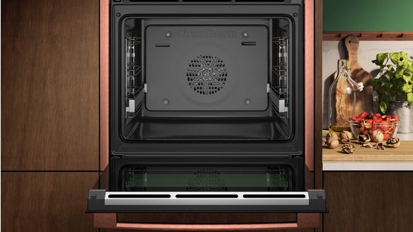 Built-in oven Neff B29CR3AY0 from FlexDesign Series with a capacity of 71L and A+ energy class. Features 3.7" TFT color touch screen with graphics, 14 cooking modes, SoftOpen/SoftClose door system and WiFi control via HomeConnect app. In addition, features EasyClean® cleaning system, Comfort Flex telescopic shelf and CircoTherm®, Neff's outstanding hot-air system for simultaneous baking and roasting on up to 3 levels.
