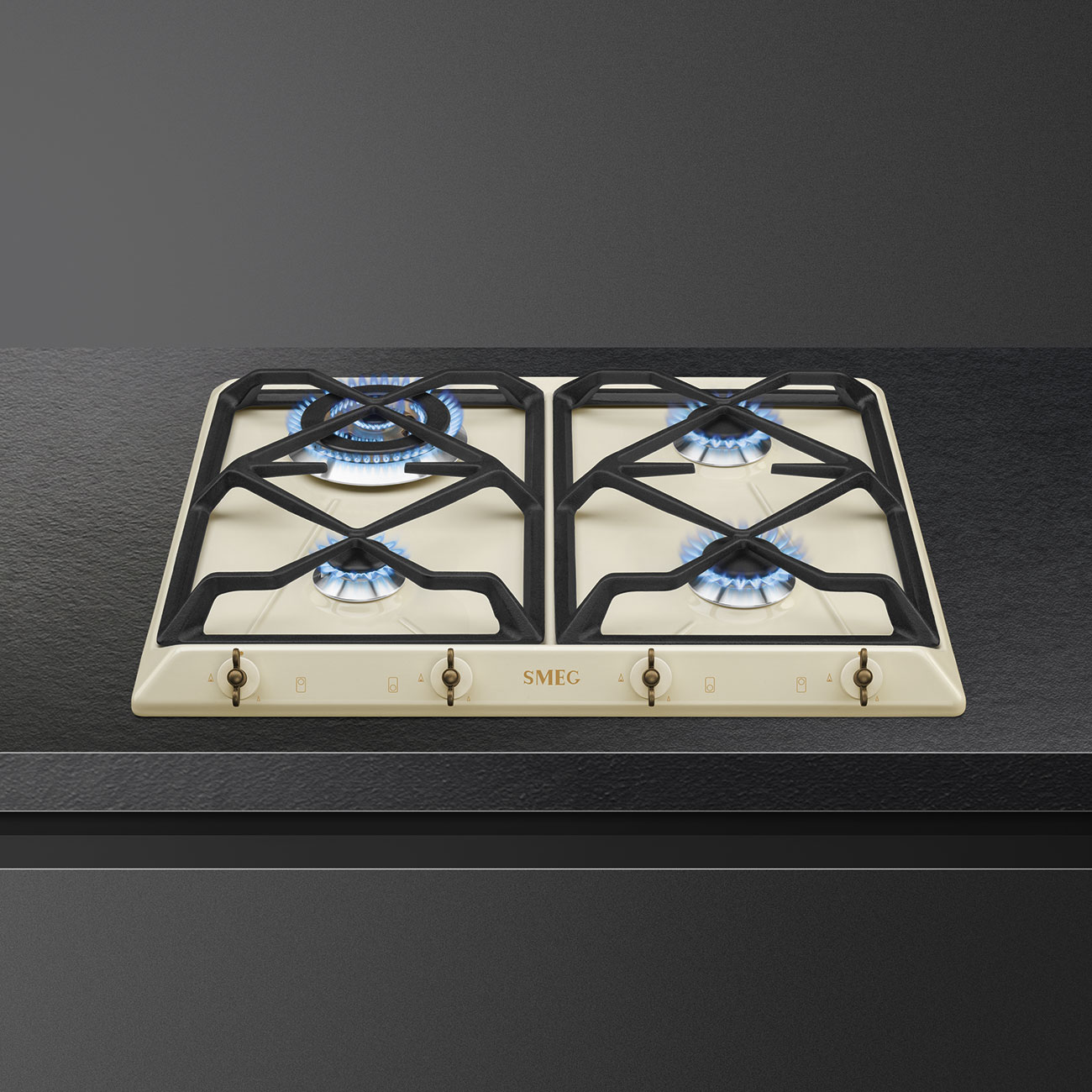 Smeg built in gas hob from Coloniale Series, 60cm width. Features Cast Iron pan supports for maximum stability and cooking convenience, easy operation via knobs with automatic ignition system, automatic gas shut-off safety system and 4 burners of 1100W, 2x1700W and Wok Burner of 3300 W.