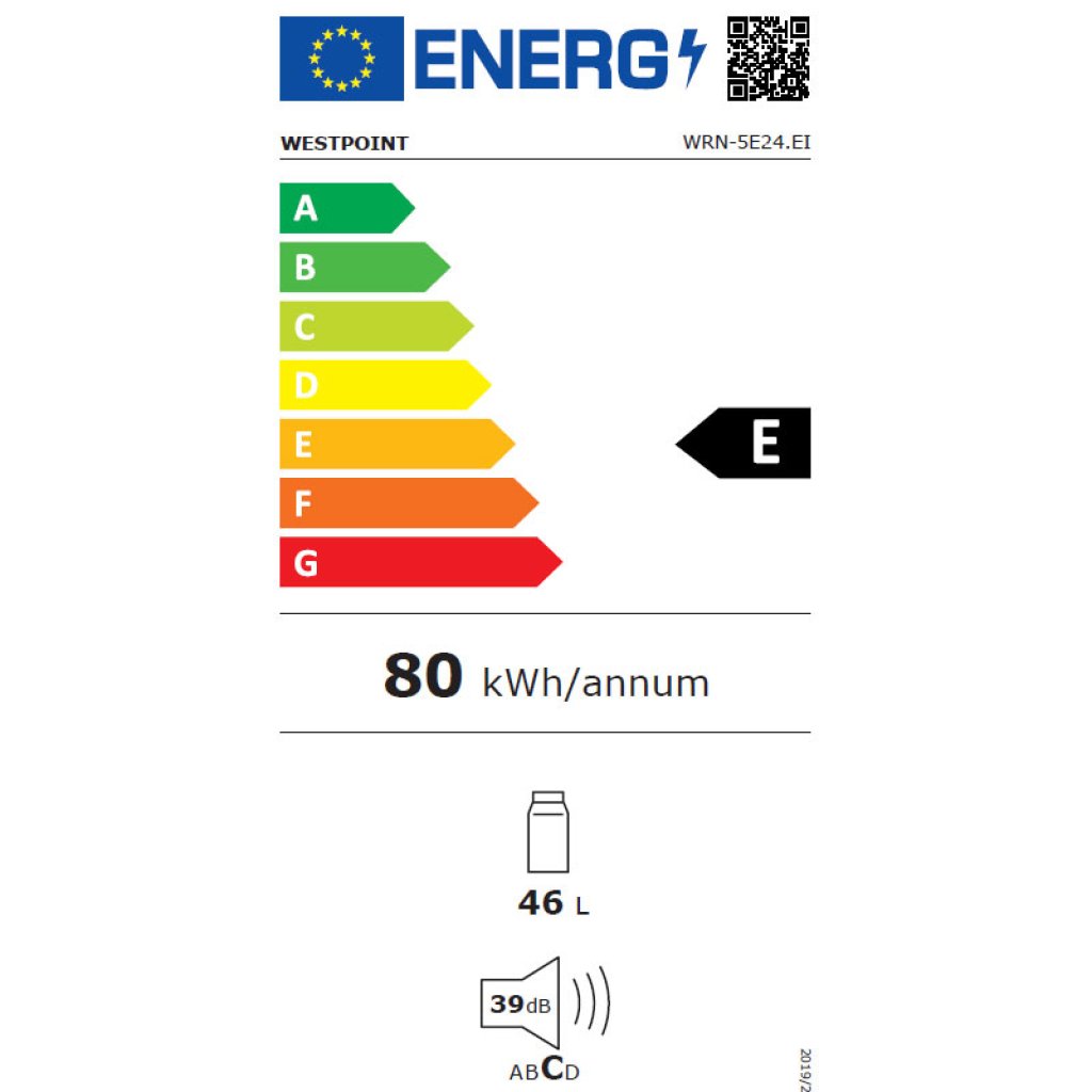 Westpoint mini bar fridge, E energy class and total net capacity of 46L, LowFrost cooling system with manual defrost, 0~4°C storage box and the ability to change the direction of the door.