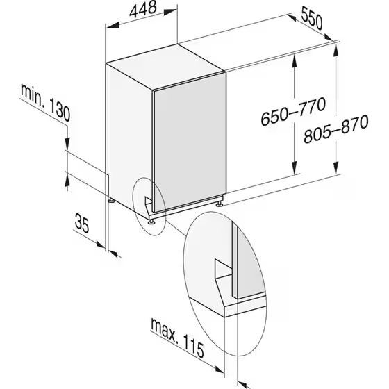 Available display languages Available display languages via MultiLingua GermanConstruction type Freestanding dishwasher NoUndercounter dishwasher NoSemi-built-in dishwasher NoFully built-in dishwasher YesDishwasher 45 cm YesDishwasher 55 cm NoDishwasher 60 cm NoXXL dishwasher NoPlanning Control panel color Stainless steel/Clean SteelControl panel version Vertical control panelHandling type Program selector switchScreen 1-line text displayScreen color WhiteMultilingual YesComfort Knock2open NoAssisted door closing ComfortCloseBrilliantLight YesSalt compartment in the door NoRemaining time display YesProgram start scheduling up to 24 hours YesTimeControl NoPower indicator light ScreenAdd item option NoSelect display language NoNetworking with Miele@home> YesAutomatic dosing with PowerDisk NoEfficiency and sustainability Water consumption in the automatic program in l from 6.0Electricity consumption in ECO program in kWh 0.470Consumption value in kWh with hot water connection in the ECO program 0.23FlexiTimer with EcoStart NoEcoFeedback YesHot water connection YesHalf load YesNoise emissions in dB(A) 43Proven hygiene YesEnergy Star NoENERGY STAR® Maximum efficiency NoEcoPower Technology YesNoise emission level BEnergy efficiency class (AG) BEnergy consumption in the ECO program in kWh after 100 program cycles 47ECO program duration in minutes 230Quality of results Dishwasher with fresh water system YesDrying with AutoOpen technology YesSensorDry YesTurbothermic drying with recirculation YesPerfect GlassCare NoDetergentAgent NoActive condensation drying YesBrilliantGlassCare YesWashing programs ECO YesAutomatic YesSensorWash NoIntensive 75°C YesLightly soiled 50°C NoNormal 55°C NoSoft YesQuick wash 40°C NoQuickPowerWash YesHygiene YesSolarSave YesExtraQuiet 38 dB(A) NoExtraQuiet 40 dB(A) YesPasta/paella YesTall objects 65°C YesThermos for glasses YesDevice care YesRinse and pause NoGrills and filters NoNormal 60°C NoDishwasher options Turbo mode NoIntensive wash in the lower basket NoShort YesIntensive wash on the bottom rack NoExtremely economical NoSoaking NoPre-wash NoAutoDos NoIntenseZone YesExpress YesAdditional wash YesAdditional drying YesTechnology and quality EcoTech heat exchanger NoTechnical data Minimum height of wall opening in mm 805Device width in mm 448Device height in mm 805Device depth in mm 550Depth in cm with door open 116.5Net weight in kg 40.8Total connection power in kW 2.000Voltage in V 230Safety in A 10Number of phases 1Electrical frequency standard 50Water supply pipe length in cm 1.50Water drain pipe length in cm 1.50Power cable length in m 1.70Minimum width of the wall opening in mm 450Depth of installation opening in mm 550Maximum width of wall-mounting opening in mm 450Maximum height of wall opening in mm 870Minimum facade weight in kg 2.0Maximum facade weight in kg 8.0Basket design Additional cutlery basket NoBasket design MaxiComfort 45 cmPlenty of tableware 9FlexCare cup holder 2Safety WPS leak protection system YesFilter indicator light NoSecurity lock YesSystem lock No Downloads