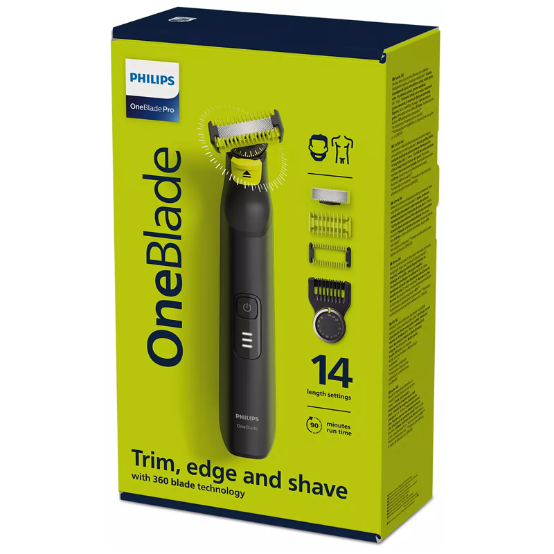 The Philips OneBlade Pro 360 shaver is a new revolutionary hybrid styling device, suitable for face and body, with which you can trim, shave and create clean lines and angles on beards of any length. Features innovative 360 Blade that can flex in all directions to adjust to the curves of your face, Dual-sided design for precision and control and 2 attachments for body and sensitive areas. It has a rechargeable Li-Ion battery for 90' of use with a charging indicator.