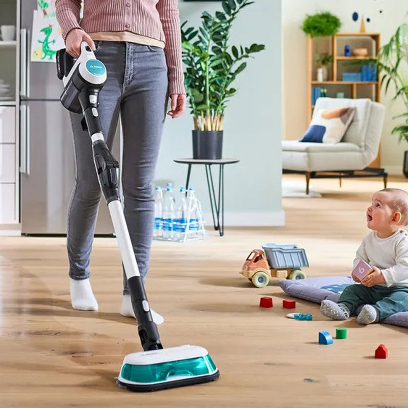Now with the Bosch Unlimited 7 ProHygienic Aqua stick vacuum cleaner you can sweep and mop at the same time, for effortless hygienic cleaning. The high air flow picks up dust and dirt, while the two rotating pads are continuously wetted with fresh clean water and clean stains on every floor. So you can enjoy maximum hygiene by filtering up to 99.97% of dust particles and mopping with easy removal of soiled pads without contact.