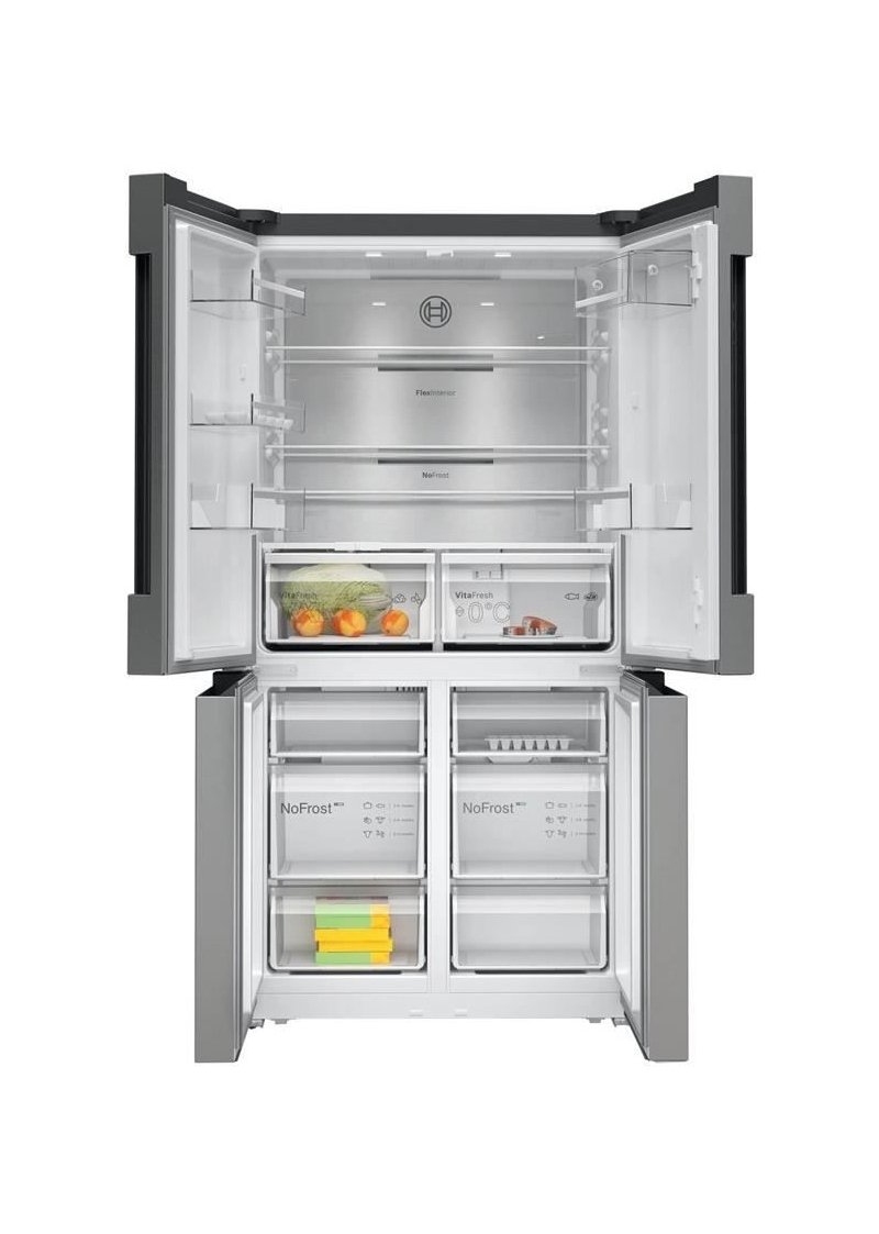 Bosch Series|6 4-door Fridge-Freezer with XXL capacity of 605L that will put an end to the problem of space for your food and 4 doors to see everything at a glance without losing the cooling from inside your refrigerator. Features uniform Multi Air Flow cooling system with an internal MetalCooling metal surface at the rear of the fridge, remote control via the HomeConnect app and Inverter Compressor for ideal cooling and top energy performance.