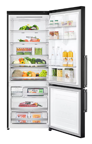 Lg GBB569MCAMB bottom freezer Total No Frost Refrigerator, E Energy Class and total net capacity 462L in Black Mat color. It features DoorCooling+™, Multi Air Flow technology , Moist Balance Crisper function, Smart Diagnosis and 10-year guarantee for Linear Compressor.