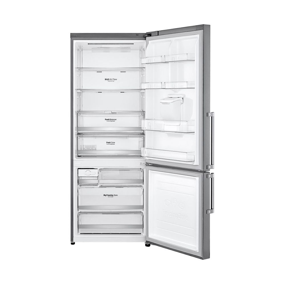Lg GBF567PZCMB bottom freezer Total No Frost Refrigerator, E Energy Class and total net capacity 461L in Platinum Silver color with water dispenser. It features DoorCooling+™, Multi Air Flow technology , Moist Balance Crisper function, Smart Diagnosis and 10-year guarantee for Linear Compressor.